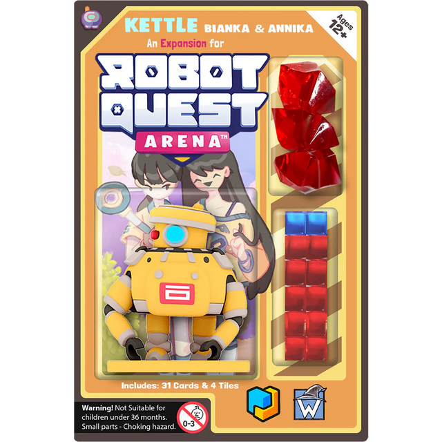 This expansion pack for Robot Quest Arena includes the Kettle robot mini and player board, 4 tiles, 20 Defense cards for the Shop Deck, an 11-card starting deck, 3 gems, 2 blue cubes, and 8 red cubes.