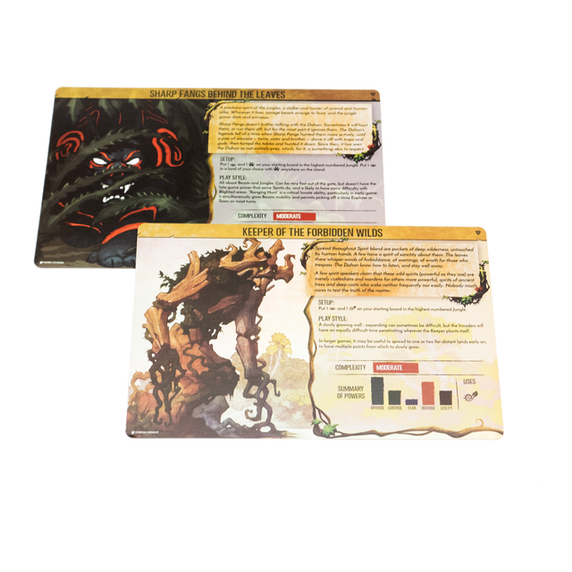 All the same Spirit information, but with intricate foiled art on high-quality cardstock. Shine as you grow, expand, and save your island. The Spirits Sharp Fangs Behind the Leaves and Keeper of the Forbidden Wilds are included in this set.