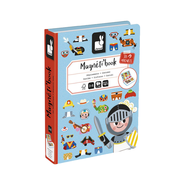 Magnetic educational game in cardboard for boys on the outfit theme. Composed of 36 magnets and 8 cards. Once the book is opened, the aim is to make on the stage the same outfit as indicated on the card thanks to the magnets. This product is made of FSC® -certified and other controlled material.