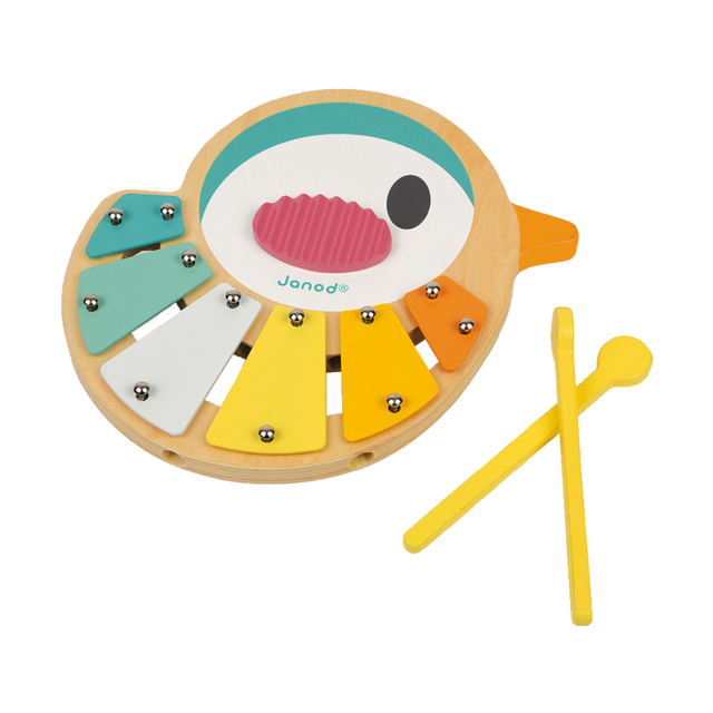Babies aged 1 year and up will be able to discover sounds and music with this pretty wooden xylophone. This bird-shaped early learning toy with hints of ultra-soft colours, will allow your child to produce their first sounds and improve their hearing. This xylophone boasts 6 tones and will be baby's first curiosity-stimulating instrument. Clever design: the bird's legs act as drumsticks and can be stored inside! For added stability, it is fitted with non-slip feet. This adorable toy can also serve as a beautiful decorative element in a child's room!