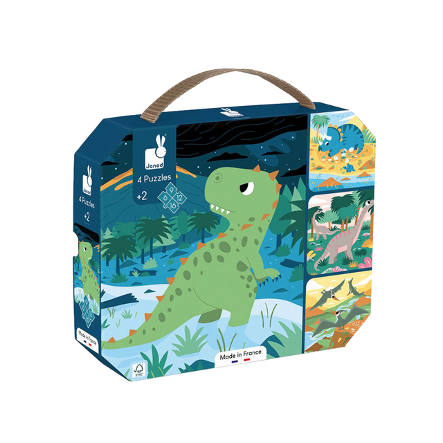 A prehistoric journey awaits your little explorers! With these 4 dinosaur-themed evolving puzzles, children aged 2 and over can explore the Jurassic period. Each puzzle – composed of 6, 9, 12 and 16 pieces, respectively – will help your child progress, whilst stimulating their fine motor skills and concentration. A challenge suited for every age!