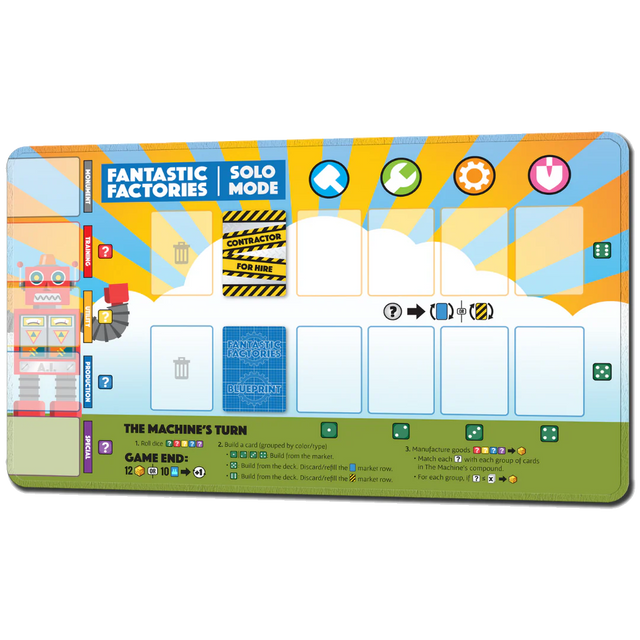 A neoprene, 24"x 14" Playmat with stitched edging made to enhance your Fantastic Factories experience. Reverse side made for Solo Mode!