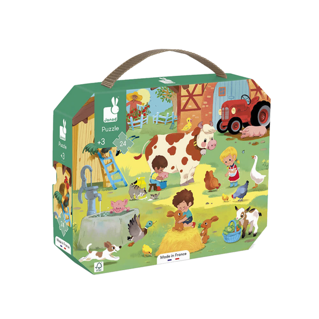 Ready for a trip to the farm? A tractor, a host of animals and a lot of funny details await your child for an entertaining and fun activity! Find the farm animals in this 24-piece cardboard puzzle. The pieces are suitable for the hands of children from 3 years old, for easy handling! What is this animal ? What are the little rabbits doing? A fun way to develop young children's memory and dexterity. This lively puzzle comes with a poster as a template, so you can put the puzzle together at your own pace! Comes in a pretty case with handle, for easy storage of the pieces and transport. This delightful puzzle is made in France. The forest-based material in this product is recycled. Decorated with vegetable inks, this puzzle promises long hours of fun!